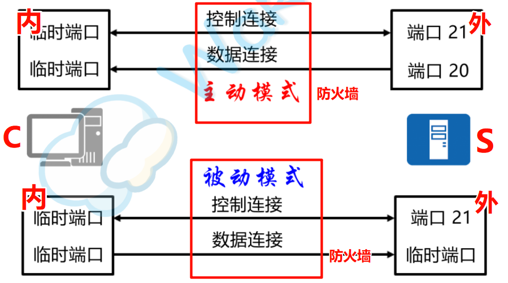 - 在主动模式下,从外到内是S找C所以过不了防火墙主动流量进不来(只有内部向外部发出后外部的回包可以进来)。