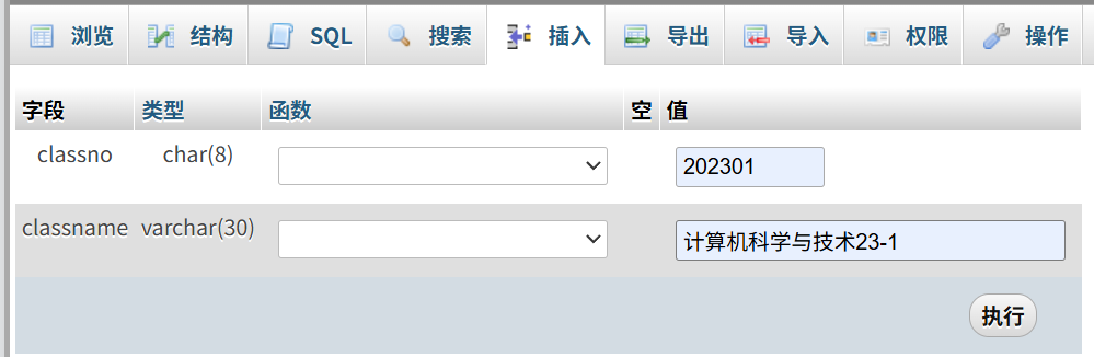 $sql="insert into student values('$stuno','$stuname','$password','$classname','$sex',